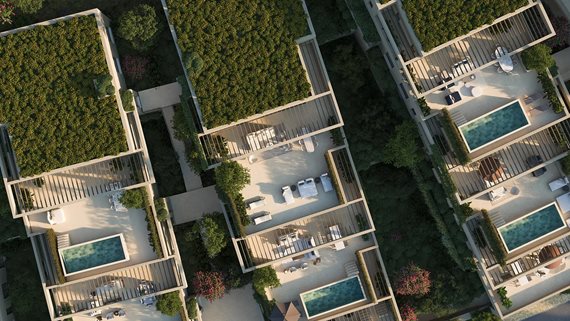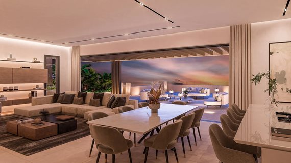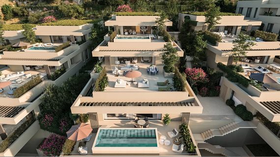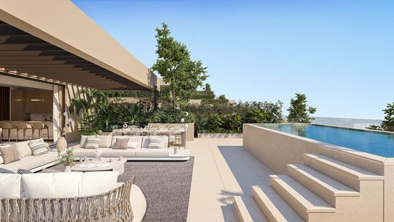 Diese Neubau-Residenzen verbinden die Großzügigkeit eines Hauses mit der Bequemlichkeit eines Apartments. Jede Einheit erstreckt sich über ein oder zwei Ebenen und ist so angelegt, dass viel Licht und Privatsphäre geboten werden. Bodentiefe Fenster öffnen sich zu weitläufigen Terrassen, von denen aus sich eindrucksvolle Ausblicke bis zum Meer genießen lassen. Jede Villa verfügt über eine direkte Liftverbindung von der Tiefgarage ins eigene Zuhause, was den Alltag besonders komfortabel gestaltet.
