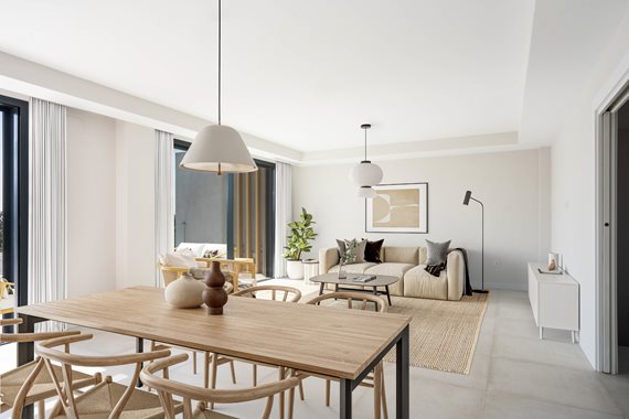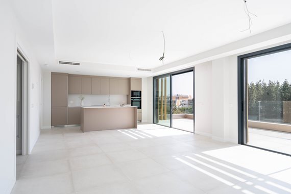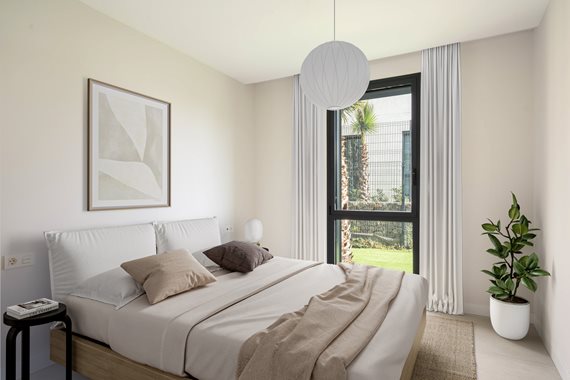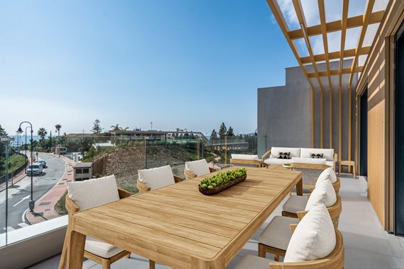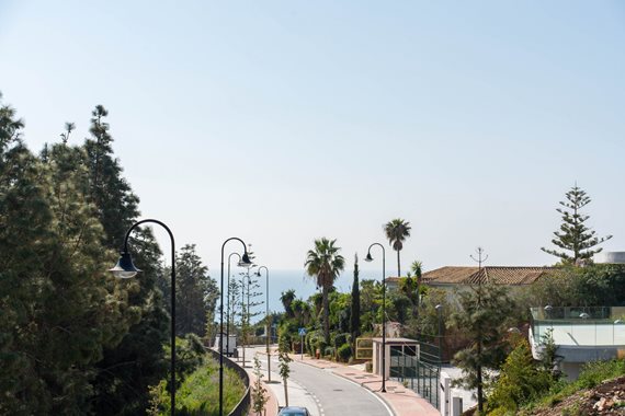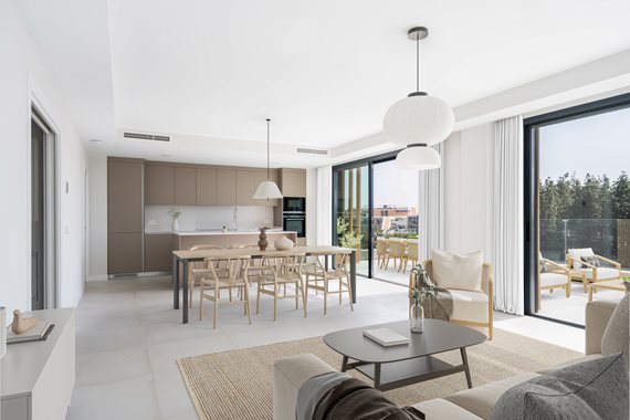 In einer ruhigen, gepflegten Anlage nahe dem Strand und dem Clubhaus des beliebten Golfplatzes El Chaparral gelegen, bietet dieses moderne Reihenhaus eine gelungene Kombination aus Komfort, Natur und mediterraner Atmosphäre. Helle, großzügige Räume und eine offene Gestaltung sorgen für ein angenehmes Wohngefühl. Der fließende Übergang zwischen Wohn-, Ess- und Küchenbereich schafft ein offenes, freundliches Ambiente, während große Fenster viel Tageslicht hereinlassen und den Blick auf die Umgebung freigeben. Hochwertige Materialien, integrierte Geräte und dezente Beleuchtung betonen das klare Design. Auf der Terrasse genießt man den Panoramablick bis zum Meer. Ein Fitnesscenter ist bequem zu Fuß erreichbar, der Strand und La Cala de Mijas liegen nur wenige Minuten entfernt – ideal für ein aktives und entspanntes Leben an der Costa del Sol.