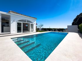 Charmante familievilla in Andalusische stijl op wandelafstand van strand, winkels en restaurants. Ideaal voor gezinsleven met tuin, zwembad en mooi uitzicht op zee en bergen.